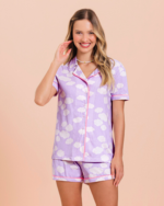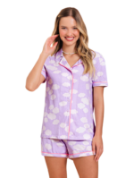 - A combinação do lilás do fundo com o branco das nuvens faz do nosso short doll manga curta aberto um verdadeiro sonho.